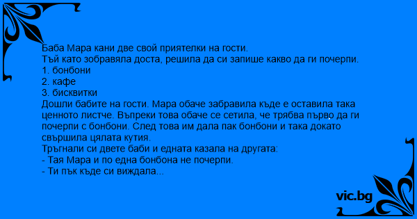 Дошли бабите на гости. Мара обаче забравила къде е оставила така ценното листче. Въпреки това обаче се сетила, че трябва първо да ги почерпи с бонбони. След това им дала пак бонбони и така докато свършила цялата кутия.