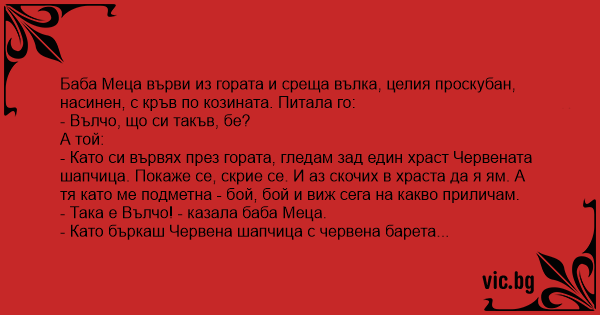 - Като си вървях през гората, гледам зад един храст Червената шапчица. Покаже се, скрие се. И аз скочих в храста да я ям. А тя като ме подметна - бой, бой и виж сега на какво приличам.