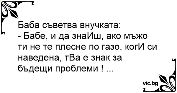 - Бабе, и да знаИш, ако мъжо ти не те плесне по газо, когИ си наведена, тВа е знак за бъдещи проблеми ! ...