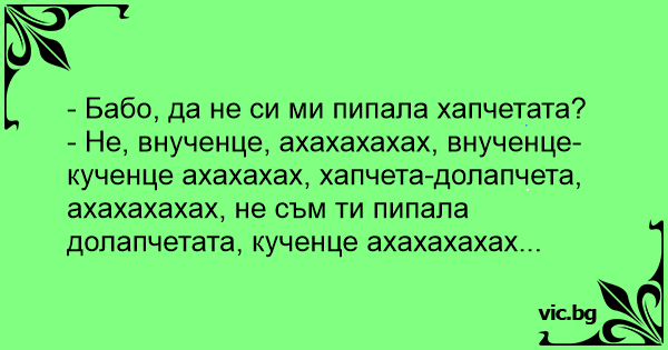 - Не, внученце, ахахахахах, внученце-кученце ахахахах, хапчета-долапчета, ахахахахах, не съм ти пипала долапчетата, кученце ахахахахах...