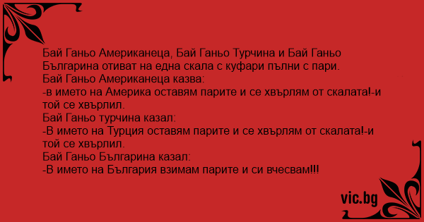 Бай Ганьо Американеца, Бай Ганьо Турчина и Бай Ганьо Българина отиват на една скала с куфари пълни с пари.
