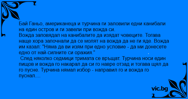 Бай Ганьо, американеца и турчина ги заловили едни канибали на един остров и ги завели при вожда си.