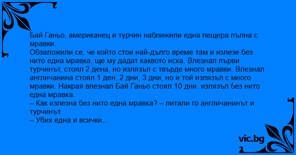 Обзаложили се, че който стои най-дълго време там и излезе без нито една мравка, ще му дадат каквото иска. Влезнал първи турчинът, стоял 2 дена, но излязъл с твърде много мравки. Влезнал англичанина стоял 1 ден, 2 дни, 3 дни, но и той излязъл с много мравки. Накрая влезнал Бай Ганьо стоял 10 дни. излязъл без нито една мравка.