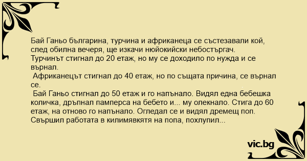 Бай Ганьо стигнал до 50 етаж и го напънало. Видял една бебешка количка, дръпнал памперса на бебето и... му олекнало. Стига до 60 етаж, на отново го напънало. Огледал се и видял дремещ поп. Свършил работата в килимявкятя на попа, похлупил му я и продължил. Стигнал до 70 етаж, но коремът му се надул. Напипал в джоба си една винена тапа от, сложил си я отзад и финиширал на покрива на небостъргача.