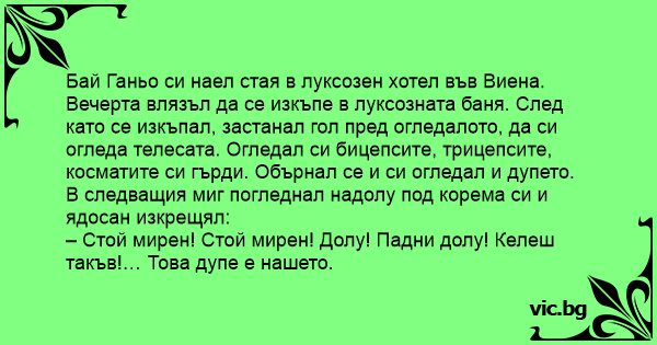 Вечерта влязъл да се изкъпе в луксозната баня. След като се изкъпал, застанал гол пред огледалото, да си огледа телесата. Огледал си бицепсите, трицепсите, косматите си гърди. Обърнал се и си огледал и дупeto. В следващия миг погледнал надолу под корема си и ядосан изкрещял: