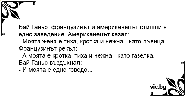 Бай Ганьо, французинът и американецът отишли в едно заведение. Американецът казал: