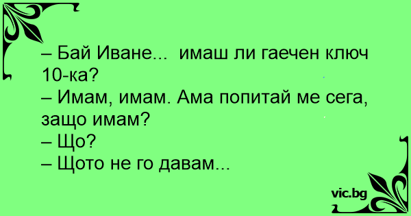 – Бай Иване... имаш ли гаечен ключ 10-ка?