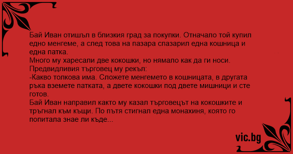 Бай Иван отишъл в близкия град за покупки. Отначало той купил едно менгеме, а след това на пазара спазарил една кошница и една патка.