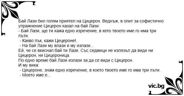 Бай Лази бил голям приятел на Цицерон. Веднъж, в опит за софистично упражнение Цицерон казал на бай Лази: