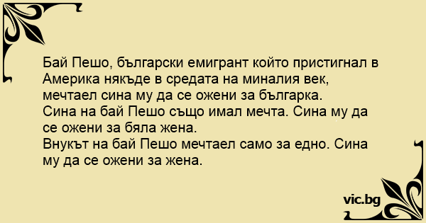 Сина на бай Пешо също имал мечта. Сина му да се ожени за бяла жена.