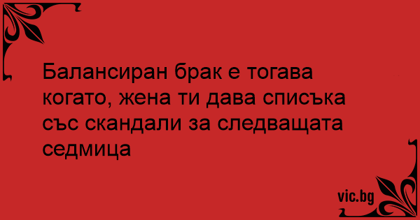 Балансиран брак е тогава когато, жена ти дава списъка със скандали за следващата седмица