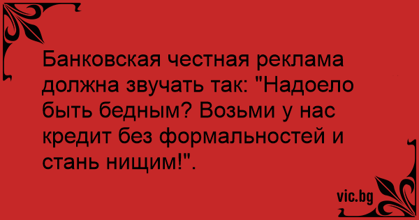 Банковская честная реклама должна звучать так: "Надоело быть бедным? Возьми у нас кредит без формальностей и стань нищим!".