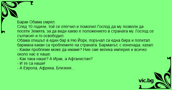 Обама, радостен, горд и доволен, изпил бирата си и казал: