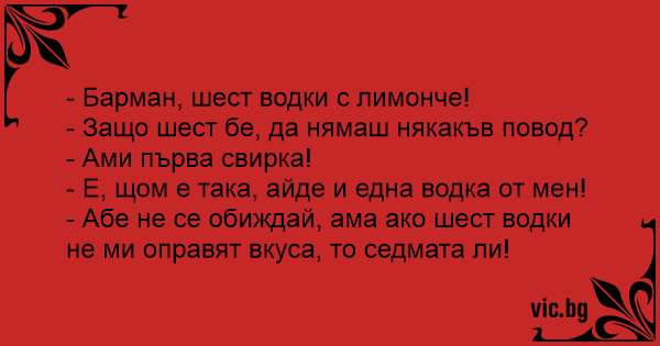 - Барман, шест водки с лимонче!