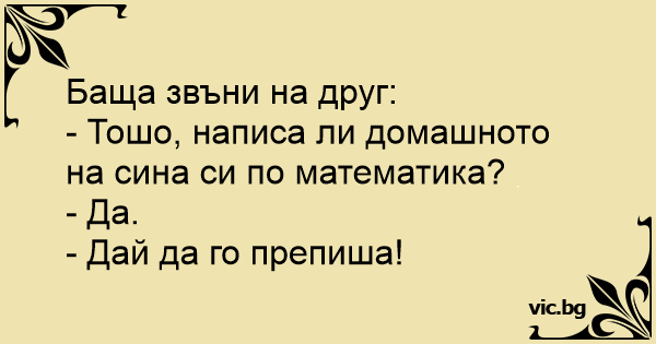 Един баща звъни на друг: папа звонит к соседу: - вы сделали за сына домашнее задание по... отец вовочки звонит соседу: - вы уже сделали сыну домашнее задание... Telefon: "Papi, es ist Ninas Vater. Er lässt fragen, wann du mit meinen Hausaufgaben fertig bist. Er möchte sie dann abschreiben." Батько дзвонить сусіду: — Ви зробили за сина домашнє завдання з математики? — Зробив... — А дайте списати! - Halo sąsiedzie! Czy pan już zrobił swojemu synowi zadanie z matematyki? - Tak, przed chwilą. - A da pan spisać? Ѕвони телефонот: