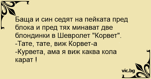 Баща и син седят на пейката пред блока и пред тях минават две блондинки в Шевролет "Корвет".