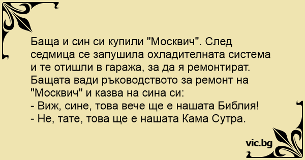 Баща и син си купили "Москвич". След седмица се запушила охладителната система и те отишли в гаража, за да я ремонтират. Бащата вади ръководството за ремонт на "Москвич" и казва на сина си: