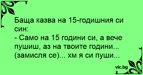 - Само на 15 години си, а вече пушиш, аз на твоите години... (замисля се)... хм я си пуши...
