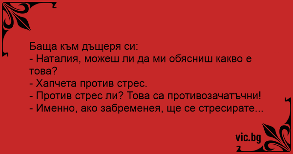 Една баба влегува во аптека и ѝ вели на аптекарката: - Ќерко, дај ми таблети против главоболка! Еве, од овие белите со сината лентичка! - Бабичке тоа се таблети за контрацепција! – Возвраќа...