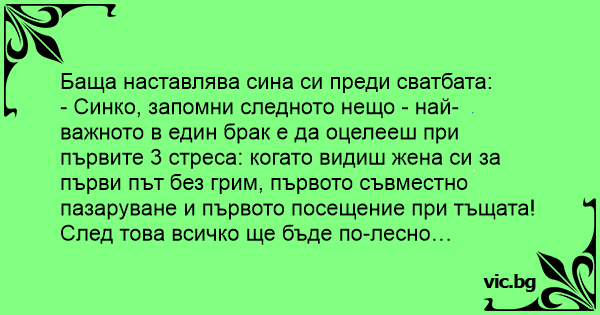 - Синко, запомни следното нещо - най-важното в един брак е да оцелееш при първите 3 стреса: когато видиш жена си за първи път без грим, първото съвместно пазаруване и първото посещение при тъщата! След това всичко ще бъде по-лесно…