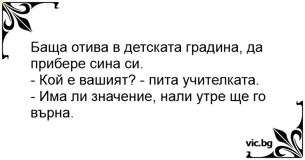 Таткото оди да го земе синот од градинка. Учителката го прашува родителот. - Кој е вашиот? - Што има врска? - Утре пак ќе го вратам!!! Ojciec odbiera pociechę z przedszkola. Nagle zwraca się do opiekunki: - Proszę Pani, ale to nie jest moje dziecko! - A co za różnica i tak Pan jutro je przyprowadzi. Egy férfi bemegy az óvodába és azt mondja: - Jöttem a gyerekemért. - Melyik lenn az Öné? - Nem mindegy! Holnap úgyis visszahozom... Ама какво си направил!