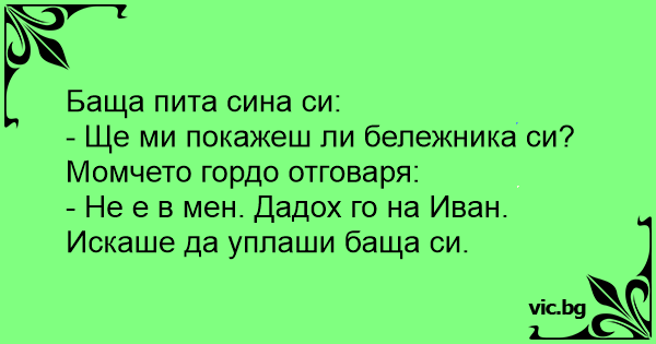 "Warum hast du kein Zeugnis?" Assim que Joãozinho chega da escola, o pai o interpela: — Quero ver o seu boletim! — Infelizmente não vai dar! — Como não vai dar? — É que eu emprestei para um amigo... ele queria dar um susto no pai dele! Johnny's father: "Let me see your report card." Johnny: "I don't have it." Johnny's father: "Why not?" Johnny: My friend just borrowed it. He wants to scare his parents." Father to son after exam: "Let me see your report card." Kommt Fritzchen am letzten Schultag nach Hause. Fragt der Vater: - Иванчо, къде ти е бележника? Dad on the last day of school: So, where’s your school report, my boy? - вовочка, где твой школьный дневник? - его колька взял. родителей... - Gdzie masz świadectwo? - pyta ojciec Jasia. - Pożyczyłem koledze, bo chciał nastraszyć swojego ojca. Mutter: "Wo ist dein Zeugnis?" Fritzchen: "Das hab ich einem Freund geborgt. Der will damit seinen Vater erschrecken." Le père de David s'étonne de ne pas avoir encore reçu le bulletin scolaire de son fils et lui en demande la raison : - Et ton bulletin il est pas encore arrivé? - Si, si mais je l'ai prêté a Paul... Mamma til Per: - Hvor er karakterboka di? - Ole låner den. - Hvorfor det? - For å skremme foreldrene sine. Dad: "Can I see your report card, son?" Son: "I don't have it." Dad: "Why?" Son: "I gave it to my friend. He wanted to scare his parents." Joãozinho chega em casa e diz ao seu pai: — Pai, hoje recebi o meu boletim. — Então cade ele? — disse o pai. — Emprestei! — Mas por quê? — Porque meu amigo queria assustar o pai dele.