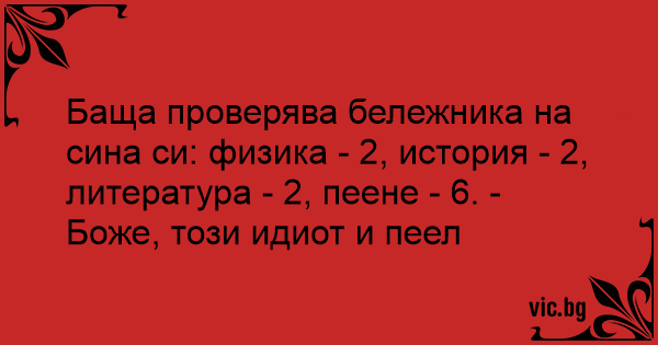 Баща проверява бележника на сина си: физика - 2, история - 2, литература - 2, пеене - 6. - Боже, този идиot и пеел