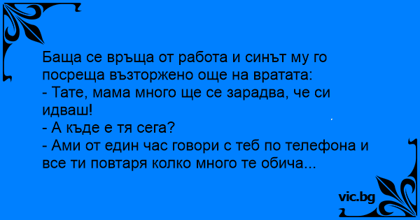 Баща се връща от работа и синът му го посреща възторжено още на вратата: