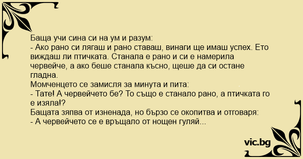 - Тате! А червейчето бе? То също е станало рано, а птичката го е изяла!?
