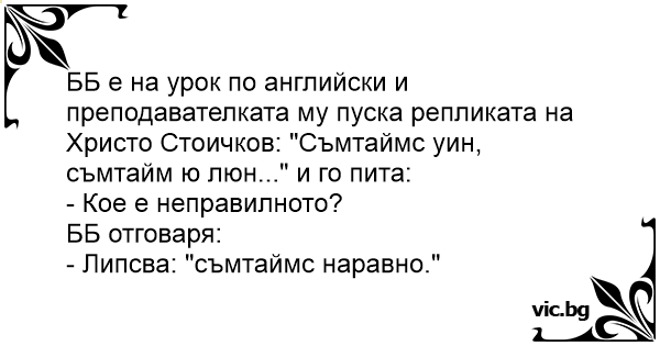 ББ е на урок по английски и преподавателката му пуска репликата на Христо Стоичков: "Съмтаймс уин, съмтайм ю люн..." и го пита: