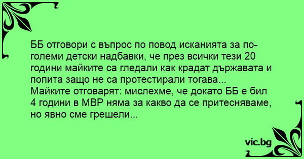 ББ отговори с въпрос по повод исканията за по-големи детски надбавки, че през всички тези 20 години майките са гледали как крадат държавата и попита защо не са протестирали тогава...