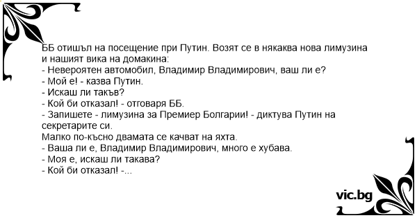 - Запишете - лимузина за Премиер Болгарии! - диктува Путин на секретарите си.