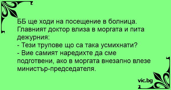ББ ще ходи на посещение в болница. Главният доктор влиза в моргата и пита дежурния: