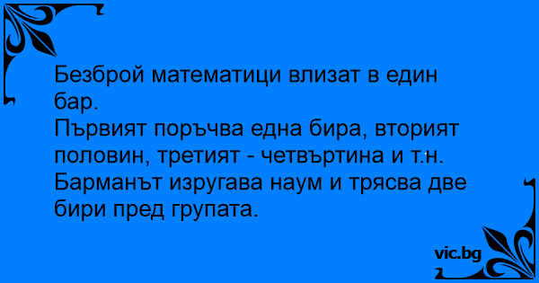 Eine unendliche Anzahl Mathematiker geht in eine Bar. Der erste bestellt ein Bier, der zweite ein halbes Bier, der nächste 1/4, und so geht das eine ganze Weile weiter… Der Barkeeper zapft 2 Bier,... Infinity mathematicians came to bar. First one ordered 1 glass of beer, second a half, third a quarter... The barman interrupted them: "Assholes, here are 2 beers!" An infinite number of mathematicians walk into a bar. The first orders a beer, the second orders half a beer, the third orders a quarter of a beer, and so on. After the seventh order, the bartender pours two beers and says, "You fellas ought to know your limits." Математици Безкраен брой математици влизат в един бар.