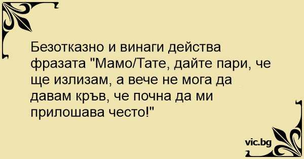 Безотказно и винаги действа фразата "Мамо/Тате, дайте пари, че ще излизам, а вече не мога да давам кръв, че почна да ми прилошава често!"
