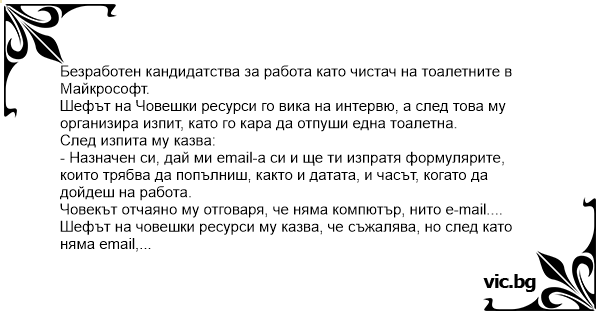 Egy munkanélküli jelentkezett a Microsofthoz, takarítói állásra. A HR-es behívta, elbeszélgetett vele, és tesztelte: söpörje fel a padlót, és utána azt mondta: - Ok, felveszlek, add meg az e-mail...