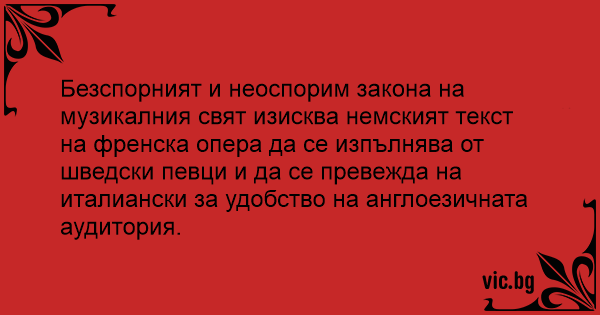 Безспорният и неоспорим закона на музикалния свят изисква немският текст на френска опера да се изпълнява от шведски певци и да се превежда на италиански за удобство на англоезичната аудитория.