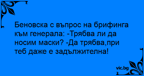 Беновска с въпрос на брифинга към генерала: -Трябва ли да носим маски? -Да трябва,при теб даже е задължителна!