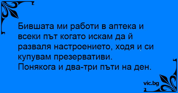 Бившата ми работи в аптека и всеки път когато искам да й разваля настроението, ходя и си купувам презервативи.
