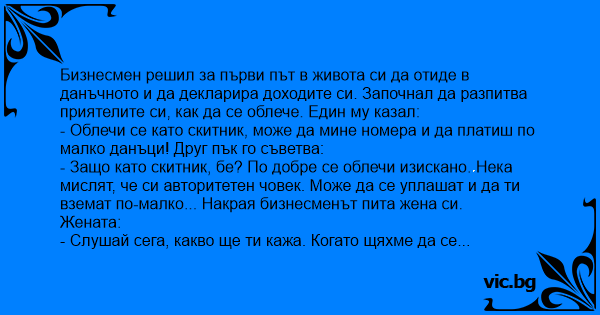 Бизнесмен решил за първи път в живота си да отиде в данъчното и да декларира доходите си. Започнал да разпитва приятелите си, как да се облече. Един му казал: