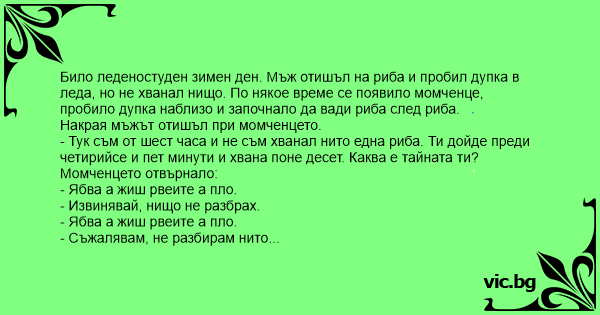 - Тук съм от шест часа и не съм хванал нито една риба. Ти дойде преди четирийсе и пет минути и хвана поне десет. Каква е тайната ти?