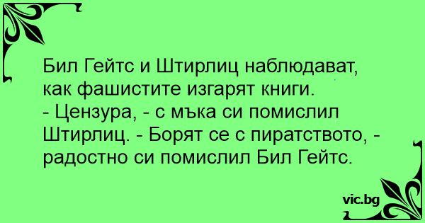 - Цензура, - с мъка си помислил Штирлиц. - Борят се с пиратството, - радостно си помислил Бил Гейтс.