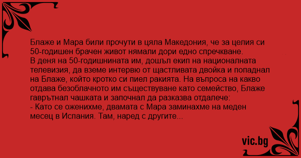В деня на 50-годишнината им, дошъл екип на националната телевизия, да вземе интервю от щастливата двойка и попаднал на Блаже, който кротко си пиел ракията. На въпроса на какво отдава безоблачното им съществуване като семейство, Блаже гаврътнал чашката и започнал да разказва отдалече:
