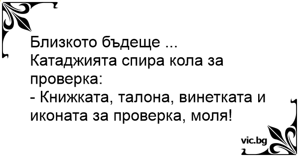 - Книжката, талона, винетката и иконата за проверка, моля!