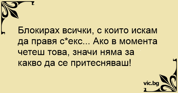 Блокирах всички, с които искам да правя cekc... Ако в момента четеш това, значи няма за какво да се притесняваш!