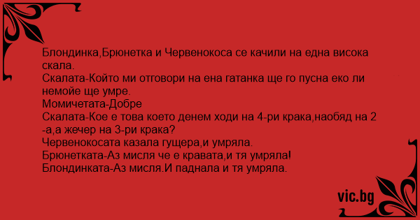 Детектор El catalán el de Lepe y el madrileño diciendo mentiras El gallego, el andaluz, el valenciano y el polígrafo Ο καθρέφτης.. ведьма поймала блондинку, брюнетку и рыжую. и говорит:"если вы мне... В един козметичен магазин е поставено всевиждащо огледало, което поглъща всеки, който излъже. Une brune, une rousse et une blonde doivent passer devant un miroir magique. Elle doivent prononcer chacune à leur tour quelque chose. Havia um espelho mágico cuja característica especial era fazer desaparecer qualquer pessoa que dissesse uma mentira na sua frente. Certo dia, três mulheres vieram se consultar com ele: uma morena, uma ruiva e uma loira. A morena olha o espelho e diz: — Eu penso que sou a mais linda mulher do... There is legend that goes like this: In a bar in New York there is a magical mirror If you go up to it and tell it the truth it will grant you a wish If you lie – poof it swallows you up. A brunette, a blonde and a redhead walk into this bar. They head straight for the mirror. The redhead goes... C'est une blonde une brune et une rousse qui passe devans le miroir de la vériter la brune passe devant et dit - Moi je pense que je suis la plus intelligente et pouf le miroir l'aspire. La rousse... Trois femmes passent au détecteur de mensonge. La première, rousse, dit : - "Moi je pense que je suis la plus belle..." et le détecteur de se mettre immédiatement à biper. La deuxième, brune, dit :...