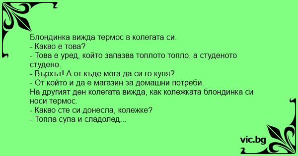На другият ден колегата вижда, как колежката блондинка си носи термос.