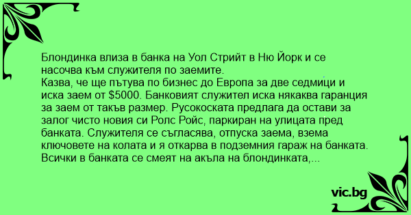 Блондинка влиза в банка на Уол Стрийт в Ню Йорк и се насочва към служителя по заемите.