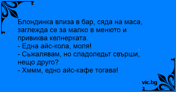 Блондинка влиза в бар, сяда на маса, заглежда се за малко в менюто и привиква келнерката.