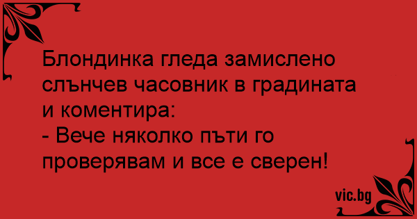 Блондинка гледа замислено слънчев часовник в градината и коментира: